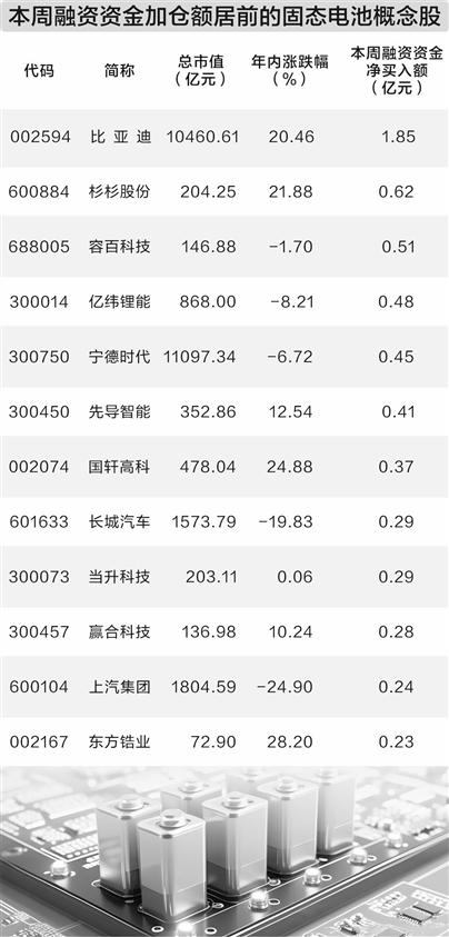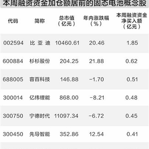 近日,固态电池热度持续提升。消息面上,行业大会密集召开。当前,第五届中国国际固态电池科技大会暨2025先进电池材料与智能装备技术展在合肥举办。接下来的大会还有首届硫化锂与硫化物固态电池论坛、2025第四届固态电池大会暨硅基负极产业创新大会等。从资金面来看,本周以来,33只固态电池概念股获融资资金加仓。其中,比亚迪获融资资金加仓1.85亿元,居首。杉杉股份、容百科技、亿纬锂能、宁德时代、先导智能等个股获融资资金加仓均超过0.4亿元。(证券时报)