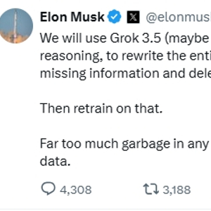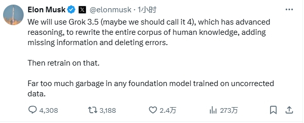 马斯克在X上发帖称:“我们将使用Grok 3.5(或许我们应该称其为4),它具备先进的推理能力,来重新编写人类全部的知识体系,补充缺失的信息并删除错误之处。然后就用这个数据集进行重新训练。任何基于未经修正数据训练的基础模型中都存在过多的垃圾信息。”