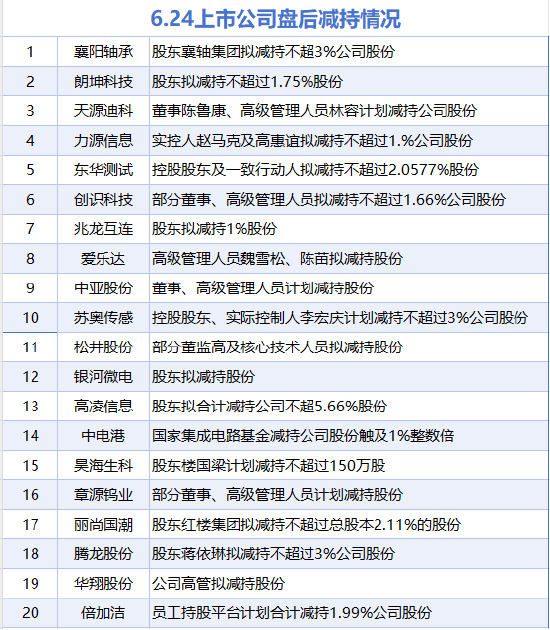据统计,6月24日,盘后包括襄阳轴承、朗坤科技、天源迪科、力源信息、东华测试、创识科技、兆龙互连、爱乐达、苏奥传感、松井股份、中亚股份、银河微电、中电港、高凌信息、昊海生科、章源钨业、丽尚国潮、腾龙股份、倍加洁、华翔股份在内的20家上市公司披露减持情况。当日暂无上市公司披露增持情况。