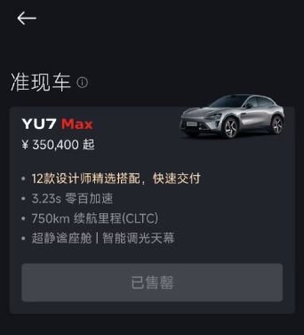 汽车APP显示,YU7 MAX准现车已售罄。