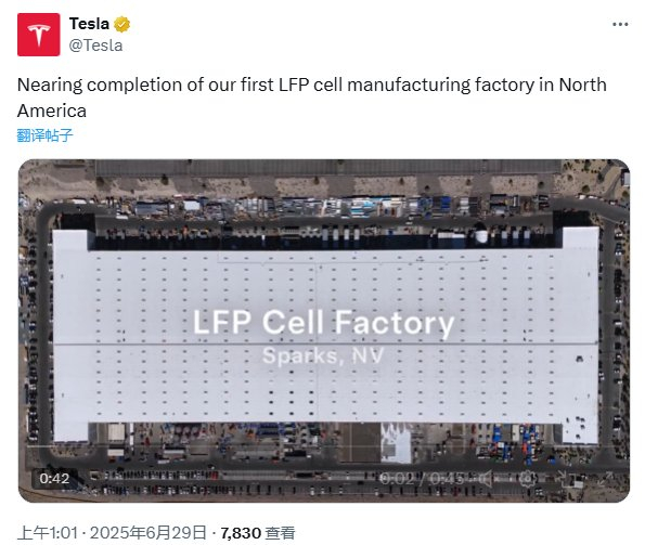 特斯拉:我们在北美的首座磷酸铁锂(LFP)电池制造工厂即将完工。