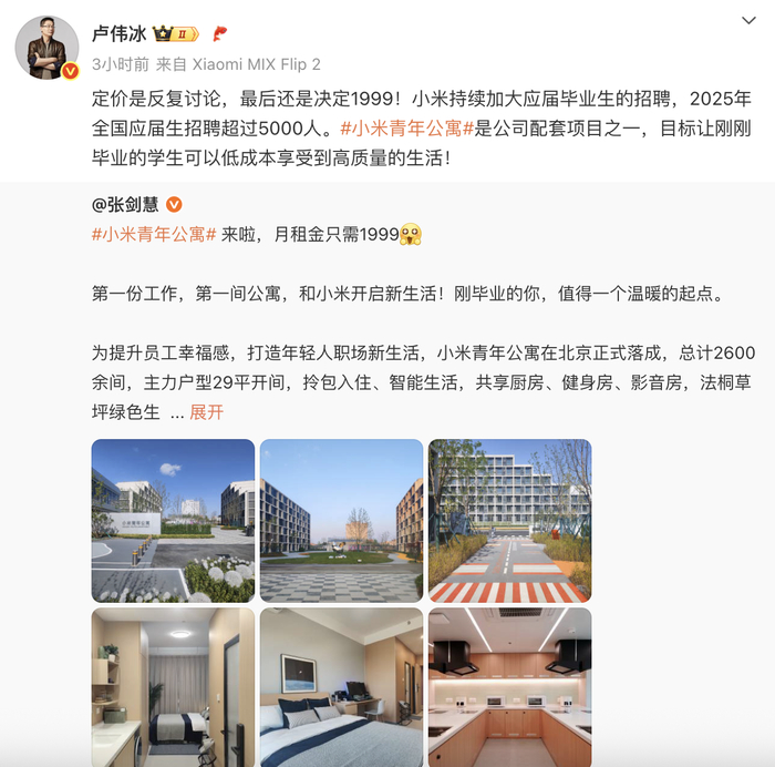 卢伟冰回应小米青年公寓定价:反复讨论,最后还是决定1999