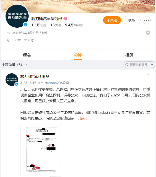 目前,赛力斯汽车法务部账号禁言已经解除。