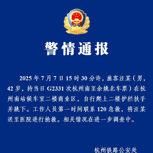 杭州铁路公安通报,7月7日15时30分许,旅客汪某(男,42岁,持当日G2331次杭州南至余姚北车票)在杭州南站候车室二楼商业区,自行爬上二楼护栏扶手并跳下。工作人员第一时间联系120急救,将汪某送至医院进行抢救。相关情况在进一步调查中。