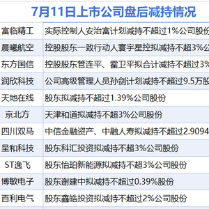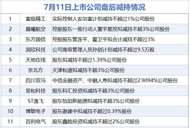 7月11日增减持汇总 滚动播报 2025.07.11 21:46 据统计,7月11日,盘后富临精工、晨曦航空、东方国信、润欣科技、天地在线、京北方、四川双马、呈和科技、ST逸飞、博敏电子、百利电气等11家上市公司披露减持情况。当日暂无A股上市公司披露增持情况。