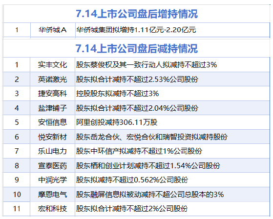 7月14日增减持汇总 滚动播报 2025.07.14 22:13 据统计,7月14日,盘后华侨城A披露增持情况。包括实丰文化、英诺激光、捷安高科、安恒信息、盐津铺子、悦安新材、乐山电力、宣泰医药、中润光学、摩恩电气、宏和科技在内的11家A股上市公司披露减持情况。