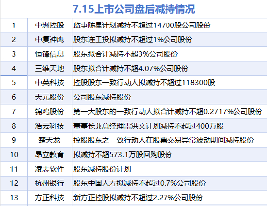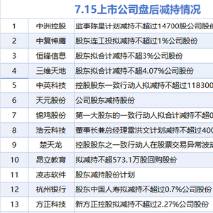 据统计,7月15日,盘后包括中洲控股、中复神鹰、恒锋信息、三维天地、中英科技、天元股份、锦鸡股份、浩云科技、楚天龙、昂立教育、凌志软件、杭州银行、方正科技在内的13家A股上市公司披露减持情况。当日暂无A股上市公司披露增持情况。