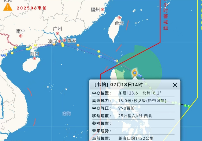 记者从海南省气象局获悉,今年第6号台风“韦帕”(热带风暴级),14时其中心位于北纬18.2度、东经123.6度,也就是在菲律宾马尼拉东北方向约490公里的洋面上,中心附近最大风力有8级(18米/秒)。海南省气象局2025年7月18日15时20分发布台风四级预警(海上)。预计,“韦帕”将以每小时20~25公里的速度向西偏北方向移动,强度逐渐加强,最强可达台风级或强台风级(13~14级,38~42米/秒),19日凌晨至上午移入南海北部海面,尔后逐渐向广东中部至海南岛东部一带沿海靠近。受其影响,19日~22日,海南省大部分海区有强风雨天气;20日~22日,海南岛有较强风雨天气。(央视新闻)