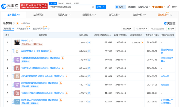 据媒体报道,中国证监会官网显示,宇树科技开启上市辅导,由中信证券担任辅导机构。根据辅导备案报告,宇树科技控股股东、实际控制人王兴兴直接持有公司23.8216%股权,并通过上海宇翼企业管理咨询合伙企业(有限合伙)控制公司10.9414%股权,合计控制公司34.7630%股权。天眼查App显示,杭州宇树科技股份有限公司成立于2016年8月,法定代表人为王兴兴,注册资本约3.6亿人民币,经营范围包括软件开发、软件销售、智能机器人的研发等,由王兴兴、美团旗下汉海信息技术(上海)有限公司、深创投中小企业发展基金(新疆)有限合伙企业等共同持股。变更记录显示,今年5月,该公司企业名称由杭州宇树科技有限公司变更为杭州宇树科技股份有限公司,今年6月,该公司注册资本由约289万人民币增至约3.6亿人民币。对外投资信息显示,该公司对外投资4家企业,分别是深圳天羿科技有限公司、北京灵翌科技有限公司、杭州宇树机器人有限公司、上海高羿科技有限公司。值得一提的是,王兴兴名下关联4家企业,分别是杭州宇树科技股份有限公司、杭州天则科技有限公司、杭州宇树机器人有限公司、天津宇树企业管理咨询合伙企业(有限合伙),王兴兴在上述企业担任执行董事兼总经理、法定代表人等职位。