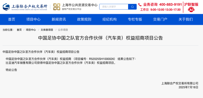 比亚迪获得中国足协中国之队官方合作伙伴(汽车类)权益招商项目 滚动播报 2025.07.20 16:21 7月18日,根据上海联合产权交易所文体旅公示项目,比亚迪汽车销售有限公司获得中国足协中国之队官方合作伙伴(汽车类)权益招商项目。