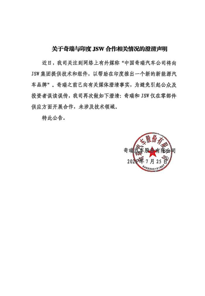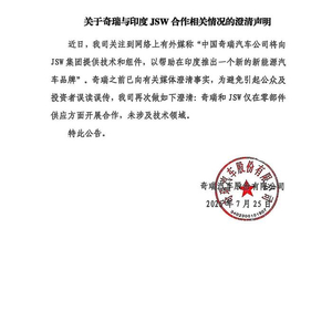 奇瑞发布澄清声明称,和JSW集团仅在零部件供应方面开展合作,未涉及技术领域。此前,网络上有外媒称“中国奇瑞汽车公司将向JSW集团提供技术和组件,以帮助在印度推出一个新的新能源汽车品牌”。