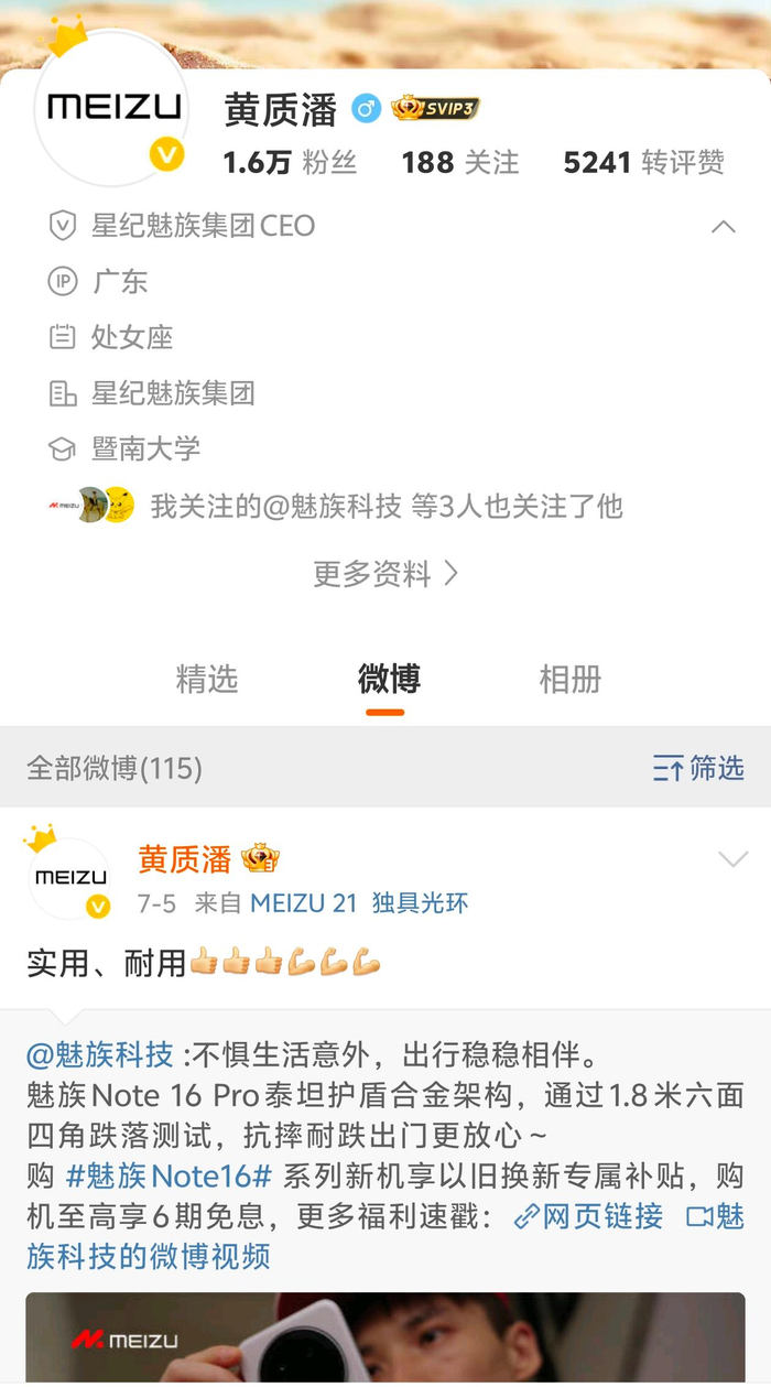 魅族再换帅?黄质潘微博认证变更为星纪魅族集团CEO