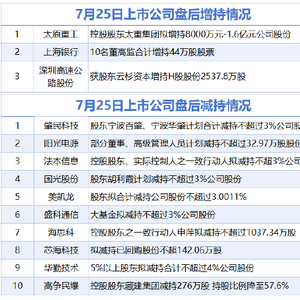 7月25日增减持汇总 滚动播报 2025.07.25 22:15 据统计,7月25日,盘后太原重工、上海银行、深圳高速公路股份等3家上市公司披露增持情况。肇民科技、阳光电源、法本信息、国光股份、美凯龙、盛科通信、海思科、芯海科技、华勤技术、高争民爆等10家上市公司披露减持情况。