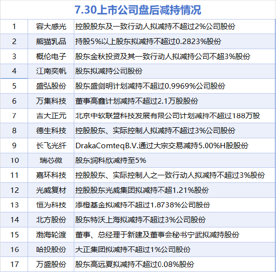 据统计,7月30日,盘后包括容大感光、熊猫乳品、概伦电子、江南奕帆、盛弘股份、万集科技、吉大正元、德生科技、长飞光纤、瑞芯微、嘉环科技、光威复材、恒为科技、北方股份、渤海轮渡、哈投股份、万盛股份在内的17家A股上市公司披露减持情况。当日暂无A股上市公司披露增持情况。
