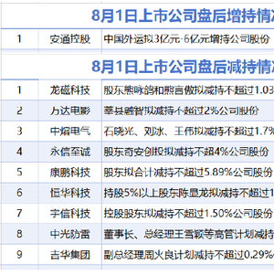 8月1日增减持汇总 滚动播报 2025.08.01 21:09 截至发稿前统计数据显示,8月1日,盘后安通控股上市公司披露增持情况。龙磁科技、万达电影、中熔电气、永信至诚、康鹏科技、恒华科技、宇信科技、中光防雷、吉华集团等9家上市公司披露减持情况。