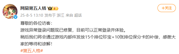8月5日,网易旗下多款游戏上午出现无法登录的问题,“网易游戏崩了”话题也冲上微博热搜。包括《阴阳师》、《第五人格》、《七日世界》、《一梦江湖》等在内的多名玩家在社交平台反馈称游戏无法登录。 《第五人格》官方表示:游戏异常登录问题现已修复,目前可以正常登录并体验。 《阴阳师》官方则称:因临时技术故障,导致阴阳师大人无法登录游戏,非常抱歉。寮办正在紧急排查修复中,会在修复完成后为受到影响的阴阳师大人们发送相关补偿,鞠躬! 《七日世界》项目组表示:通过线上反馈,我们发现部分超越者存在登录异常的情况。我们正在紧急排查问题,尽快进行修复。问题恢复后将第一时间同步大家。感谢您的理解与支持!