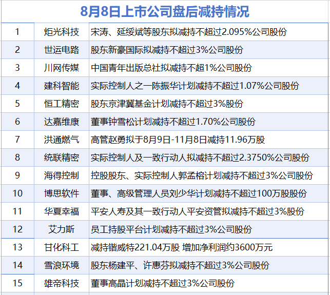 据统计,截至发稿,盘后炬光科技、世运电路、川网传媒、建科智能、恒工精密、达嘉维康、洪通燃气、统联精密、海得控制、博思软件、华夏幸福、艾力斯、甘化科工、雪浪环境、雄帝科技等15家上市公司披露减持情况。当日暂无A股增持。