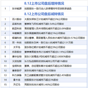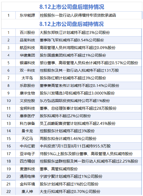 据统计,8月12日,盘后东华能源披露增持情况。包括百川股份、品茗科技、航亚科技、华建集团、银禧科技、双一科技、太平鸟、乐歌股份、康华生物、惠泰医疗、文投控股、宝明科技、科力装备、曼卡龙、天亿马、中兵红箭、亚华电子、四方精创、唐人神、麦捷科技、金科环境、通用电梯在内的22家A股上市公司披露减持情况。