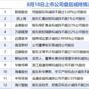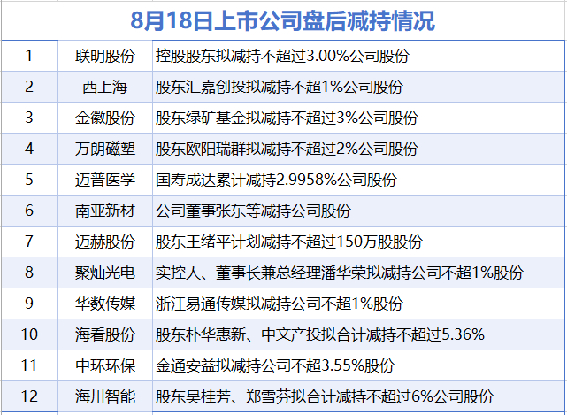 8月18日增减持汇总 滚动播报 2025.08.18 21:22 据统计,截至发稿,盘后联明股份、西上海、金徽股份、万朗磁塑、迈普医学、南亚新材、迈赫股份、聚灿光电、华数传媒、海看股份、中环环保、海川智能等12家上市公司披露减持情况。当日暂无上市公司披露增持情况。