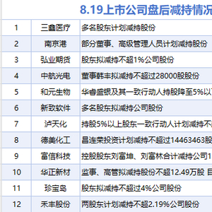 8月19日增减持汇总 滚动播报 2025.08.19 22:38 据统计,8月19日,盘后包括三鑫医疗、南京港、弘业期货、中航光电、和元生物、新致软件、泸天化、德美化工、富信科技、华正新材、珍宝岛、禾丰股份在内的12家A股上市公司披露减持情况。当日暂无A股上市公司披露增持情况。