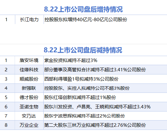 8月22日增减持汇总 滚动播报 2025.08.22 22:46 据统计,8月22日,盘后长江电力披露增持情况。包括盾安环境、佳缘科技、顺威股份、新强联、德才股份、安乃达、圣诺生物、万业企业在内的8家A股上市公司披露减持情况。