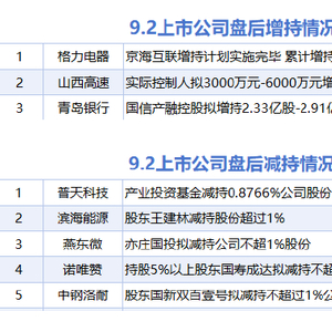 9月2日增减持汇总 滚动播报 2025.09.02 22:07 据统计,9月2日,盘后格力电器、山西高速、青岛银行披露增持情况。包括普天科技、滨海能源、燕东微、中钢洛耐、诺唯赞在内的5家A股上市公司披露减持情况。