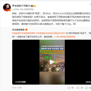 9月22日,罗永浩转发“绿茶餐厅摘掉现做招牌”博文,表示:“哈哈,这种行为确实很‘绿茶’,很Bitch。我为什么认为应该立法强制餐饮店标注是否使用了预制菜呢?如果不标注,偷偷使用了预制菜的餐厅,在竞争中就会获得成本和效率方面的优势,迫使那些不想使用预制菜的餐厅为了生存也要跟进使用,最终剩下的大部分都是劣币,会毁了整个行业。”