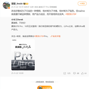 今日,真我GT8系列官宣将于10月发布,带来GT8和GT8 Pro两款年度旗舰。 新机官宣后,真我副总裁王伟发文称:“真旗舰,不改名!真我GT8 Pro,10月正式登场!我们有足够的底气和硬实力,以Pro之名,诠释Ultra级产品力。” 随后,真我中国区CMO@楚楚_Jessie 转发表示:“改名好像成为了行业的一种惯例,有时候为了冲高,有时候为了贴热。但realme就是要打破这种惯例,用产品力说话,而不是用改名发声。”