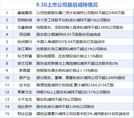 据统计,9月30日,盘后包括豪威集团、拓荆科技、芯碁微装、同花顺、杭州银行、张江高科、东方财富、新易盛、新产业、浙文互联、果麦文化、拉卡拉、润达医疗、大千生态、财达证券在内的15家A股上市公司披露减持情况。当日暂无A股上市公司披露增持情况。