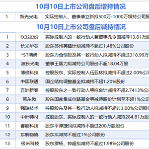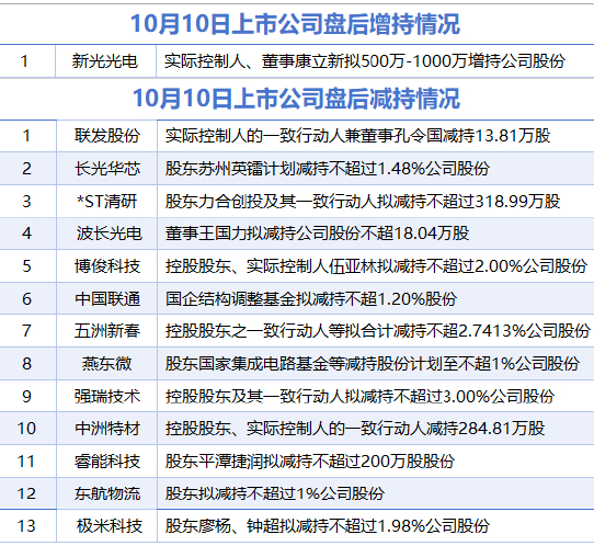 10月10日增减持汇总 滚动播报 2025.10.10 22:29 据统计,10月10日,盘后新光光电披露增持情况。联发股份、长光华芯、*ST清研、波长光电、博俊科技、中国联通、五洲新春、燕东微、强瑞技术、中洲特材、睿能科技、东航物流、极米科技等13家上市公司披露减持情况。