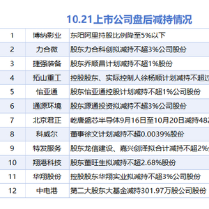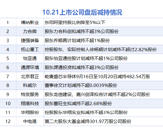 10月21日增减持汇总 滚动播报 2025.10.21 22:16 据统计,10月21日,盘后博纳影业、力合微、拓山重工、捷强装备、怡亚通、通源环境、北京君正、科威尔、特发服务、翔港科技、华翔股份、中电港等12家A股上市公司披露减持情况。当日暂无A股上市公司披露增持情况。