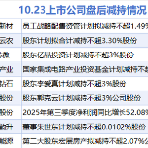 10月23日增减持汇总 滚动播报 2025.10.23 22:51 据统计,10月23日,盘后强邦新材、托普云农、力芯微、沪硅产业、力量钻石、云路股份、恒邦股份、宁波韵升、国新能源等9家A股上市公司披露减持情况。当日暂无A股上市公司披露增持情况。