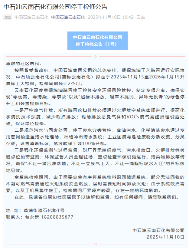 中石油云南石化有限公司:将于11月15日起停产进行为期两个月的检修。