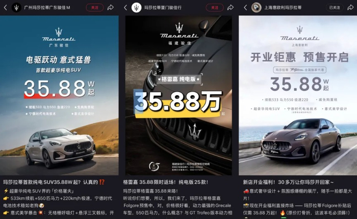 近日,多地玛莎拉蒂门店社交媒体发布海报称,玛莎拉蒂的SUV车型Grecale Folgore售价35.88万起。海报信息显示,该车型为纯电车型,采用宁德时代电池技术,续航里程533公里,购买可减免购置税。对此,记者致电经销商核实了这一价格的真实性。 销售顾问表示,35.88万是裸车价,另外还需要加上一定的选配费用,最终落地大约在40万元,外观方能与燃油版完全一致,但在设计细节上更具科技感。关于续航,官方标注为533公里,在实际综合路况下,大约能达到八折左右,400多公里。(蓝鲸新闻)