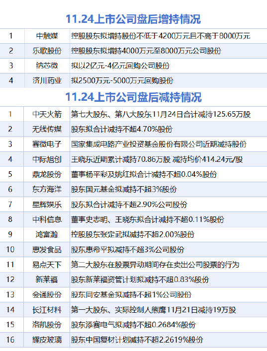 据统计,11月24日,盘后中触媒、乐歌股份、纳芯微、济川药业披露增持情况。包括中天火箭、无线传媒、赛微电子、中际旭创、鼎龙股份、东方海洋、中科信息、星辉娱乐、鸿富瀚、惠发食品、易点天下、新莱福、长江材料、会通股份、洛凯股份、耀皮玻璃在内的16家A股上市公司披露减持情况。