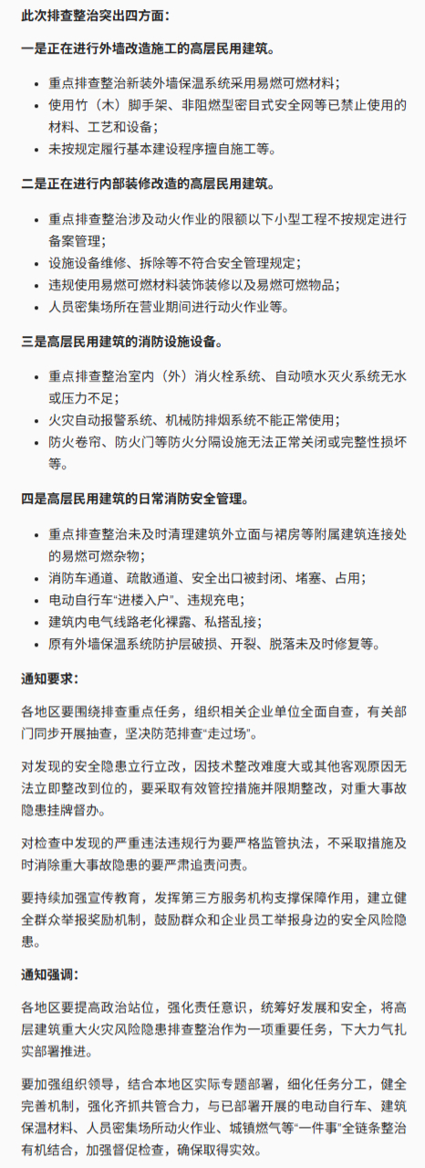 日前,国务院安委会印发通知,部署开展高层建筑重大火灾风险隐患排查整治行动,聚焦有人员居住和活动的高层民用建筑(包括居民住宅建筑和办公、医疗、商业等公共建筑)开展排查整治,特别是正在进行外墙改造施工和内部局部装修改造的高层民用建筑,全面加强高层建筑消防安全管理,切实保障人民群众生命财产安全。(央视新闻)