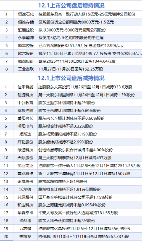 据统计,12月1日,盘后工业富联、顺灏股份、歌尔股份、顺丰控股、永泰能源、汇通控股、佰维存储、恒逸石化披露增持情况。包括佳禾智能、翱捷科技、中公教育、京粮控股、岳阳兴长、明阳电气、拓斯达、开勒股份、绿通科技、睿能科技、天际股份、茂业商业、纽威股份、沃尔德、芯原股份、华夏幸福、和达科技、福然德、力芯微、美凯龙在内的20家A股上市公司披露减持情况。