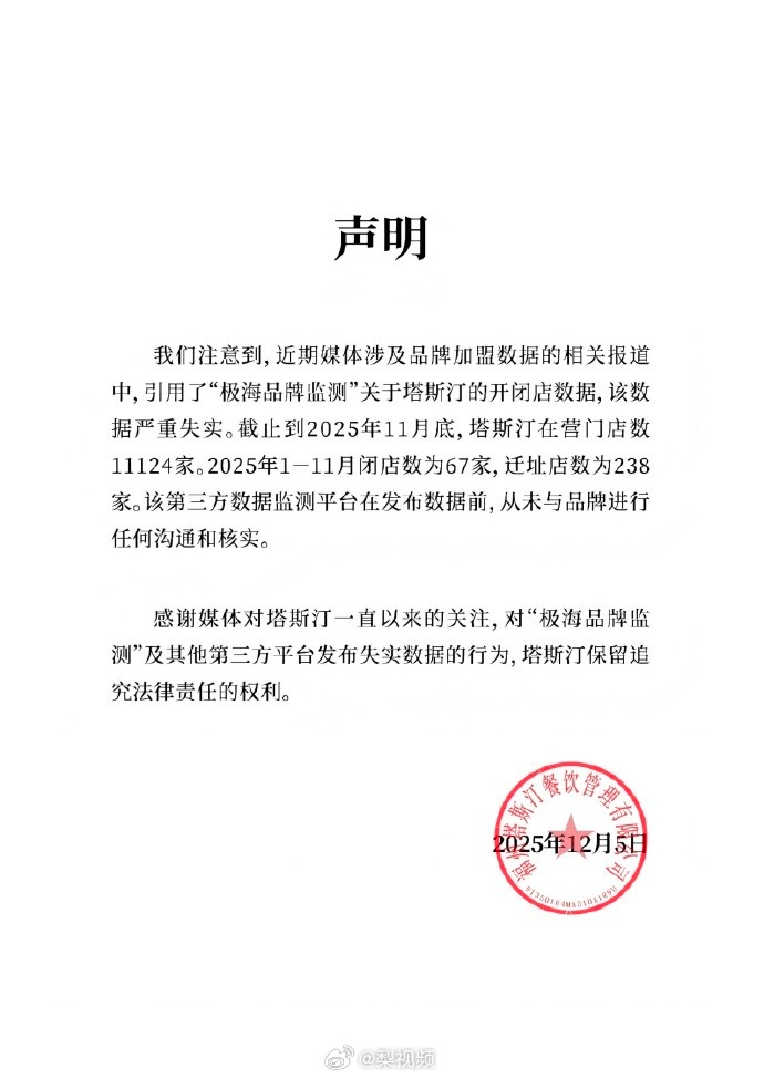 12月5日,塔斯汀发声明:我们注意到,近期媒体涉及品牌加盟数据的相关报道中,引用了“极海品牌监测”关于塔斯汀的开闭店数据,该数据严重失实。截止到2025年11月底,塔斯汀在营门店数11124家。2025年1-11月闭店数为67家,迁址店数为238家。该第三方数据监测平台在发布数据前,从未与品牌进行任何沟通和核实。感谢媒体对塔斯汀一直以来的关注,对“极海品牌监测”及其他第三方平台发布失实数据的行为,塔斯汀保留追究法律责任的权利。
