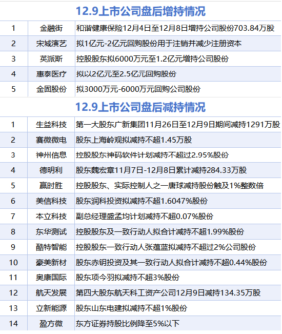 据统计,12月9日,盘后金融街、宋城演艺、英派斯、惠泰医疗、金固股份披露增持情况。包括生益科技、赛微微电、神州信息、德明利、美信科技、赢时胜、本立科技、东华测试、酷特智能、豪美新材、奥康国际、航天发展、立新能源、盈方微在内的14家A股上市公司披露减持情况。