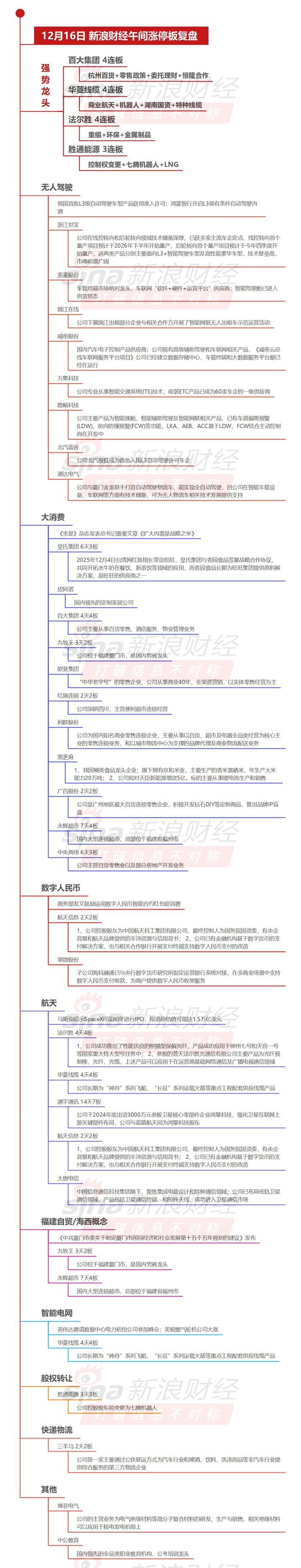 12月16日午间涨停分析 滚动播报 2025.12.16 11:57 创业板指低开低走跌2.35%、沪指跌1.22%逼近3800点,下跌个股近4500家,无人驾驶、消费股逆势上涨。华菱线缆、百大集团、法尔胜4连板,一图看懂>>