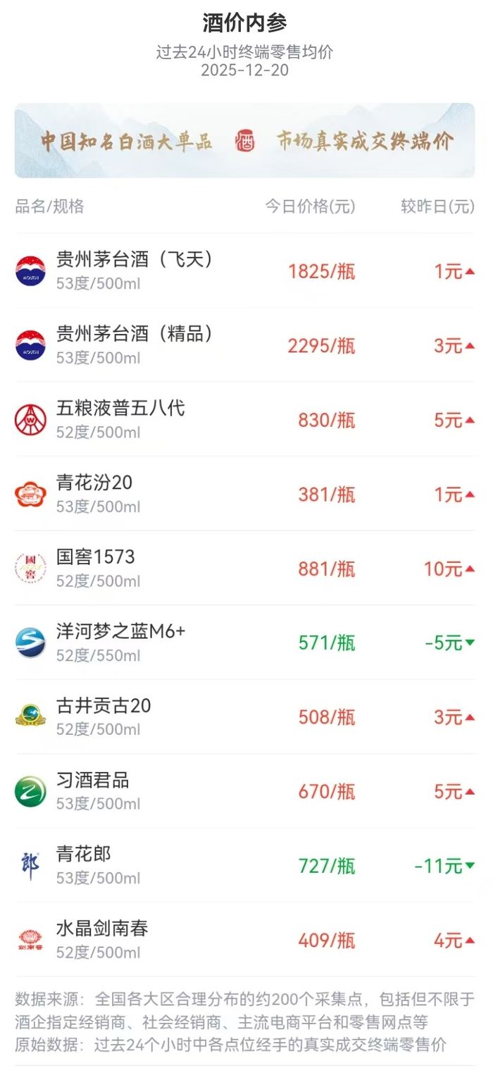 酒价内参12月20日价格发布 市场整体上扬国窖1573领涨