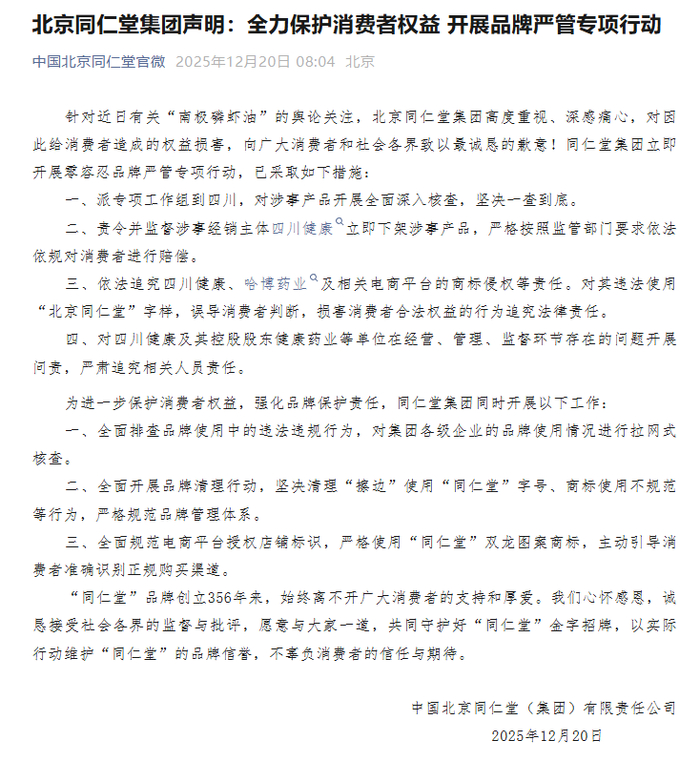 北京同仁堂发布致歉声明称,针对近日有关“南极磷虾油”的舆论关注,集团对因此给消费者造成的权益损害,向广大消费者和社会各界致以最诚恳的歉意。同仁堂集团立即开展零容忍品牌严管专项行动,已采取如下措施:派专项工作组到四川,对涉事产品开展全面深入核查,坚决一查到底;责令并监督涉事经销主体四川健康立即下架涉事产品,严格按照监管部门要求依法依规对消费者进行赔偿;依法追究四川健康、哈博药业及相关电商平台的商标侵权等责任。对其违法使用“北京同仁堂”字样,误导消费者判断,损害消费者合法权益的行为追究法律责任。