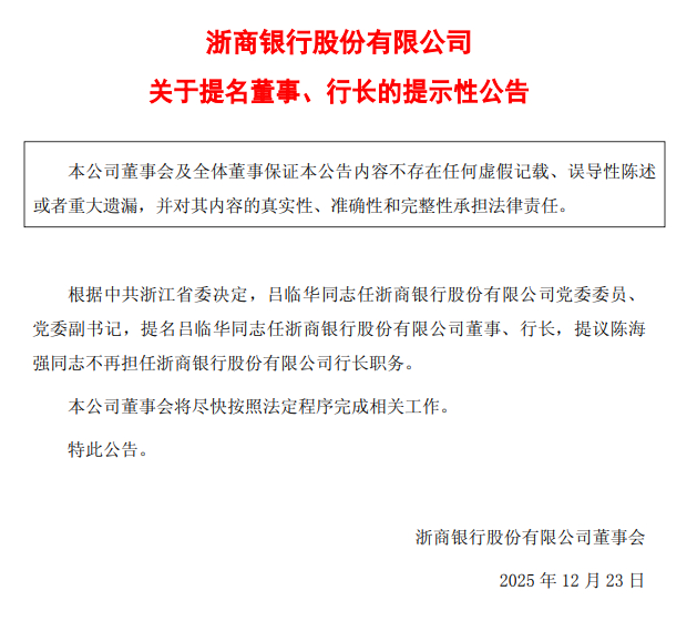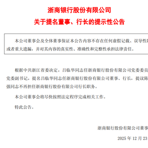 浙商银行:提名吕临华任董事、行长 滚动播报 2025.12.23 19:09 浙商银行发布公告称,根据中共浙江省委决定,吕临华任浙商银行股份有限公司党委委员、党委副书记,提名吕临华任浙商银行股份有限公司董事、行长,提议陈海强不再担任浙商银行股份有限公司行长职务。(金融一线)