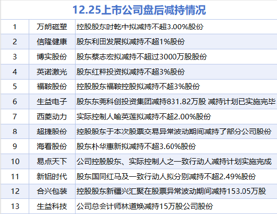 据统计,12月25日,盘后包括万朗磁塑、信隆健康、博实股份、英诺激光、福鞍股份、生益电子、西菱动力、超捷股份、海看股份、易点天下、新铝时代、合兴包装、生益科技在内的13家A股上市公司披露减持情况。当日暂无A股上市公司披露增持情况。