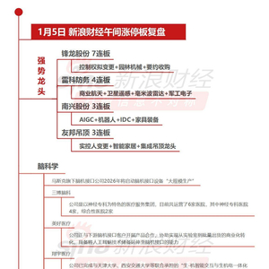 1月5日午间涨停分析 滚动播报 01.05 11:59 沪指半日涨逾1%重返4000点,创指涨超2%、科创50涨逾4%。超4000股上涨,脑机接口概念全线爆发。锋龙股份7连板,雷科防务4连板,一图看懂>>