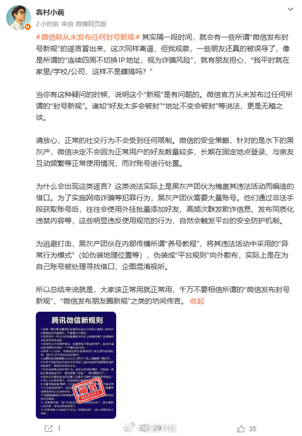 日前,网络上流传一则所谓“微信封号新规”的消息,引发不少网友关注和讨论。 对此,微信员工“客村小蒋”今日发文澄清称,微信官方从未发布过任何所谓的“封号新规”,诸如“好友太多会被封”“地址不变会被封”等说法,更是无稽之谈。 他强调,正常的社交行为不会受到任何限制,微信安全策略针对的是水下的黑灰产,不会因为正常用户的好友数量较多、长期在固定地点登录、与亲友互动频繁等正常使用情况,对账号进行处置。 此类谣言的出现,实际上是黑灰产团伙为掩盖其违法活动而编造的借口。 为逃避打击,黑灰产团伙在内部传播所谓“养号教程”,将其违法活动中采用的“异常行为模式”(如伪装地理位置等),伪装成“平台规则”向外散布,实际上是在为自己账号被处理寻找借口,企图混淆视听。 微信方面提醒,用户可放心正常使用微信,切勿轻信“微信发布封号新规”“微信发布朋友圈新规”等坊间传言。