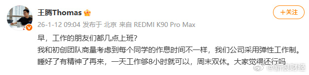 王腾发文称:我和初创团队商量考虑到每个同学的作息时间不一样,我们公司采用弹性工作制。睡好了有精神了再来,一天工作够8小时就可以,周末双休。大家觉得还行吗?