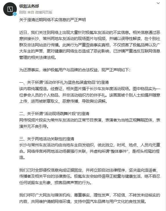 极氪法务部发布关于澄清近期网络不实信息的严正声明