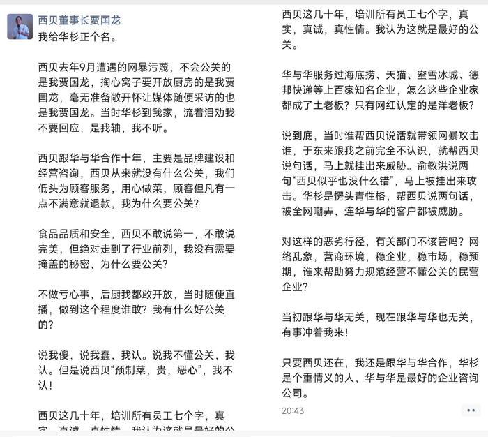 西贝贾国龙为华与华“正名”:只要西贝还在,我还跟华与华合作
