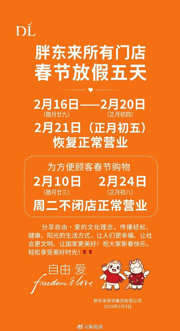 胖东来宣布春节门店放假5天 。